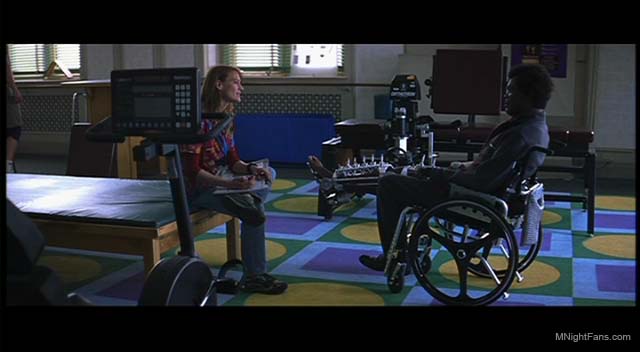 * In the scene at the rehabilitation center where a woman tells Audrey that Elijah is there, notice the child directly behind Audrey. He is stacking GREEN and ORANGE cones on top of one another. Possibly a bit foreshadowing?